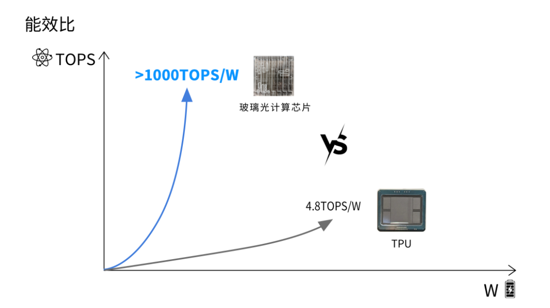 能效比方面,光本位科技利用相變材料的非易失性實現了光計算芯片零靜態功耗,只需一次電驅動即可執行完一個AI計算任務。由于玻璃的非線性光學效應極弱,因此光的波導傳播損耗極低,在芯片設計時可選擇小功率的激光器,此外玻璃在介電損耗、透光率、平整性、熱穩定性等方面的優勢也能進一步降低芯片功耗。程唐盛預測,200mm×200mm玻璃光計算芯片的能效比可以超過1000TPOS/W,相當于TPU的200倍以上。